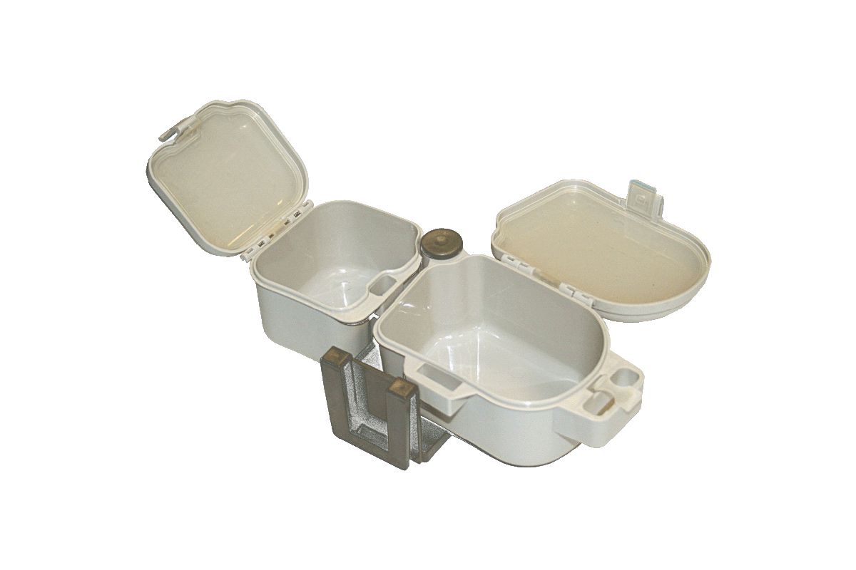 Коробочка для живой наживки с двумя отделениями и с легкосъемным креплением к ремню рыболова.