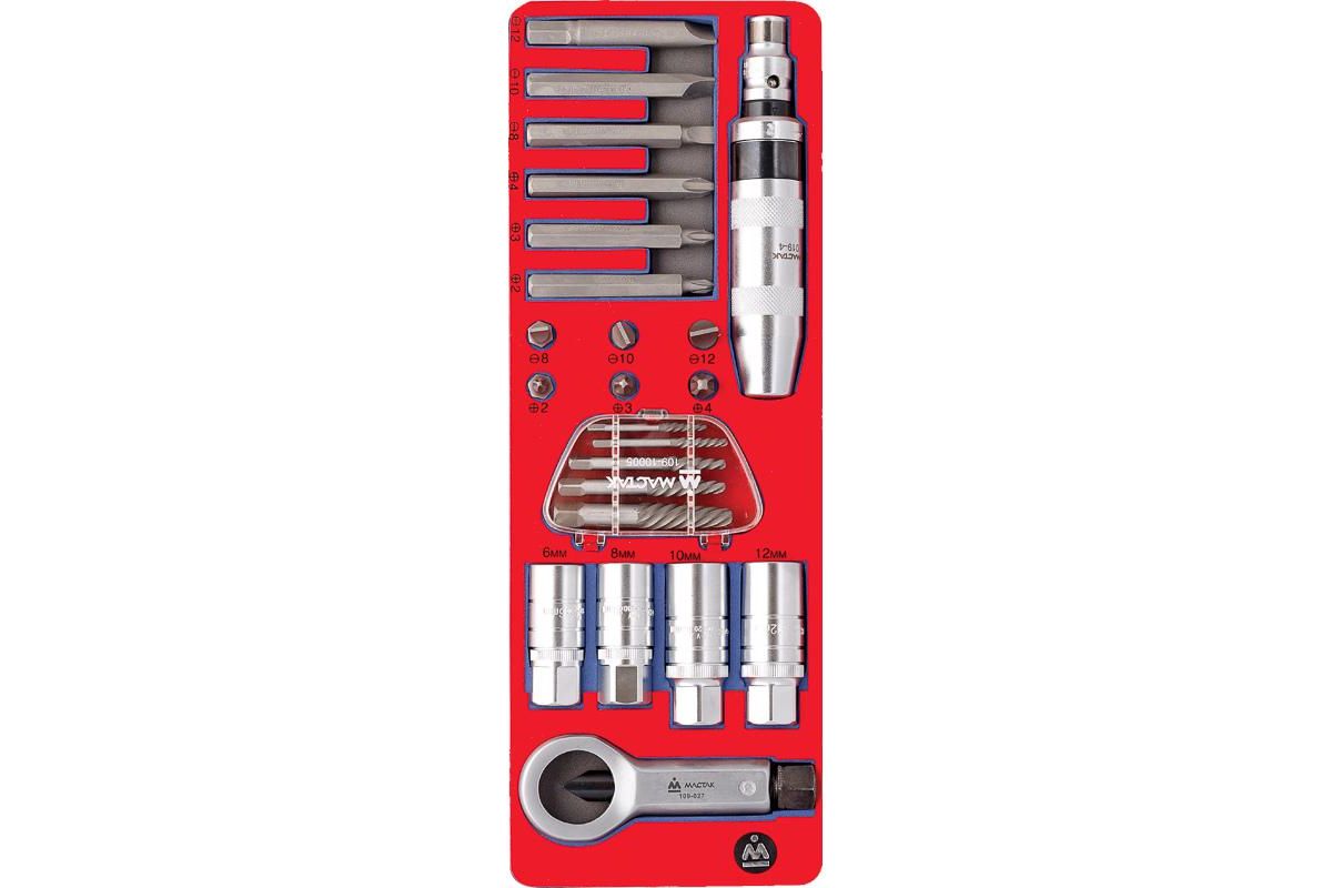 Набор инструментов 24 предмета ударная отвертка, шпильковерты, гайколом, экстракторы и насадки Мастак 5-19424 в ложементе из материала EVA предназначен для комплектации передвижных инструментальных тележек или слесарных верстаков при создании индивидуальных рабочих мест на станциях технического обслуживания автомобилей и других предприятиях, занимающихся обслуживанием и ремонтом различной техники.