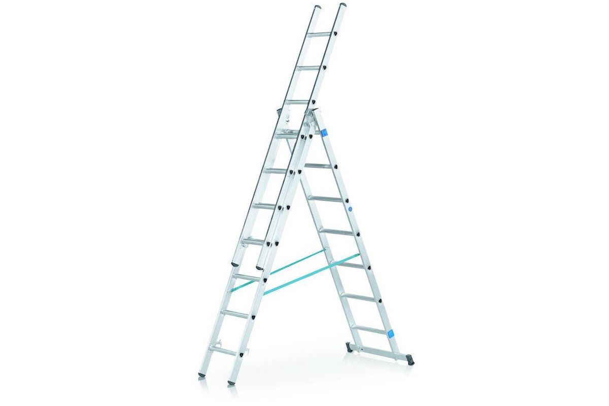 Алюминиевая многоцелевая 3х-секционная лестница 3х8, перекладины треугольного сечения. Верхнюю секцию лестницы можно использовать по отдельности в качестве приставной лестницы.